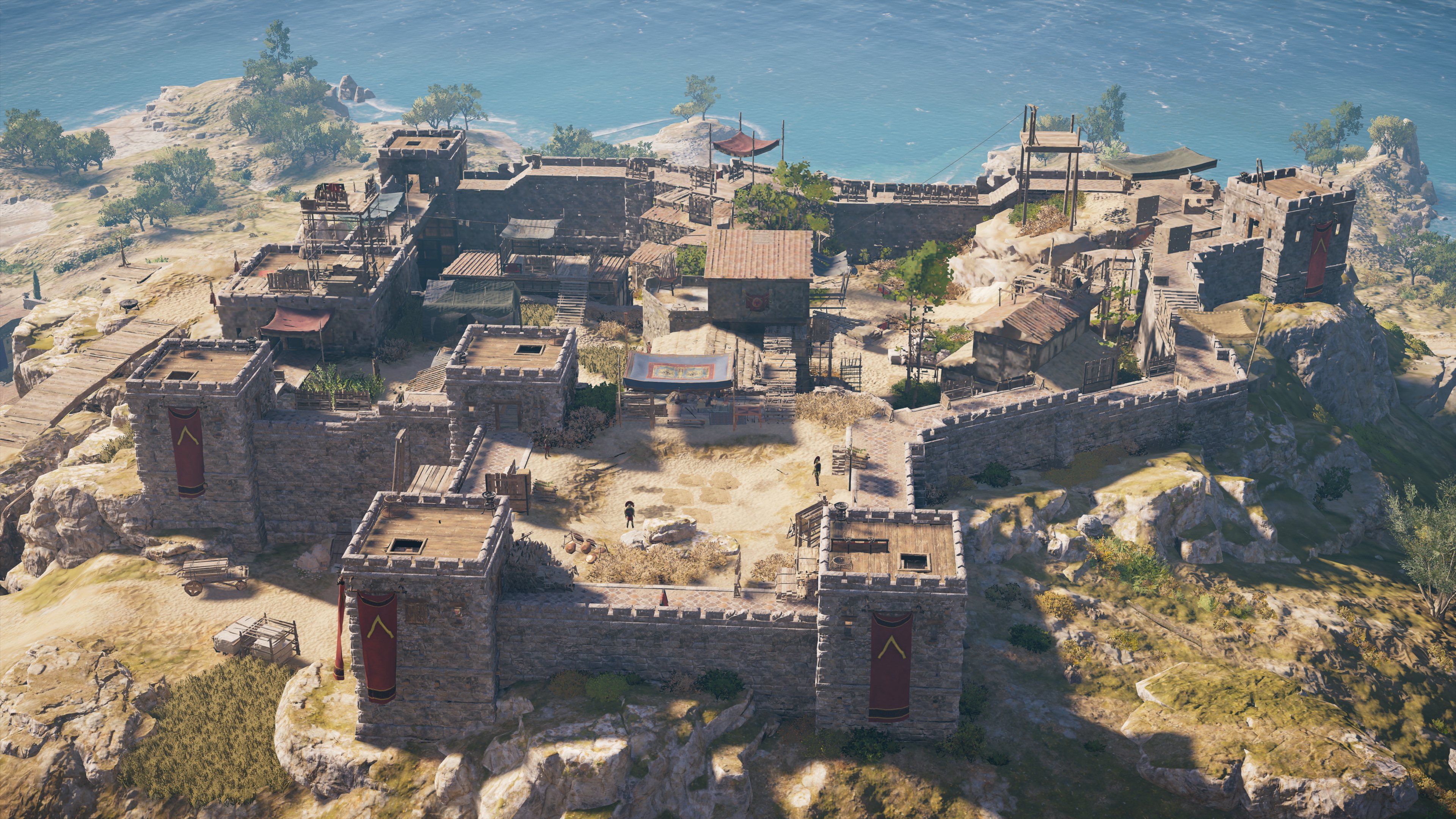 Odyssey's world is massive and varied and there's lots to love about it, but there is also plenty of room for improvement. This post will take a critical look at the game's level design and how it encourages or hinders certain playstyles. Assassin's Creed has three main pillars: combat, stealth, and parkour. Parkour rests on the quality of a level's structure and the precise layout of objects, obstacles, and the overall environment. Place too many beams and the level can appear unnatural and gamey, or even worse, cluttered and obstructed. Too few parkour objects and the player's path disappears entirely. Striking the right balance is important, and the franchise has done so successfully for years. They have recreated dozens of cities and made them both historically accurate and a joy to traverse. Odyssey is the first time I think the level design has fallen out of balance more often than it should. Parkour is probably AC's most iconic feature, so the relative lack of verticality is likely a big part of why many don't feel like an Assassin when playing the game. Odyssey if full of forts, camps, ruins, towns, cities, and other locations that function as "levels" within the overall game world. Let's break down Odyssey's level design. KeyTo analyze locations, I've marked them with colored regions. There are two main types of images: location analysis, which are in-game images of a level taken from an angle; and city analysis, which are images of the game map. The tables below will breakdown the major symbols and markings used. Others should be self-explanatory.